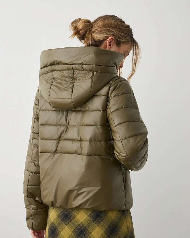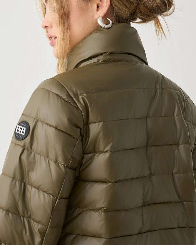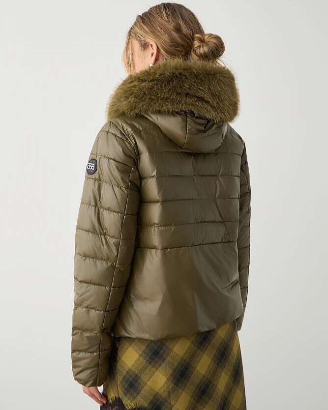 Chaqueta acolchada corta, de manga larga, con capucha desmontable y ribete de pelo sintético, cierre de cremallera y botones, con bolsillos, corte clásico.