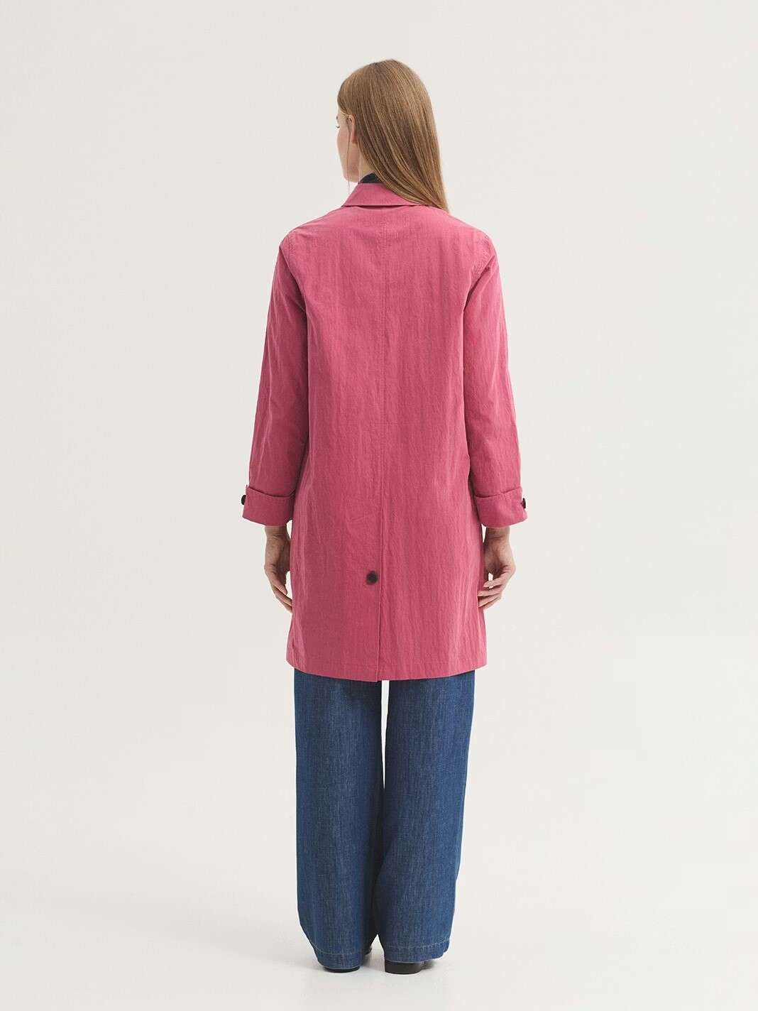 Gabardina repelente al agua confeccionada en mezcla de algodón y nailon. Presenta cuello camisero, botonadura frontal oculta y bolsillos con botón. Incluye abertura y botón en la parte trasera, y manga acabada con vuelta y botón.