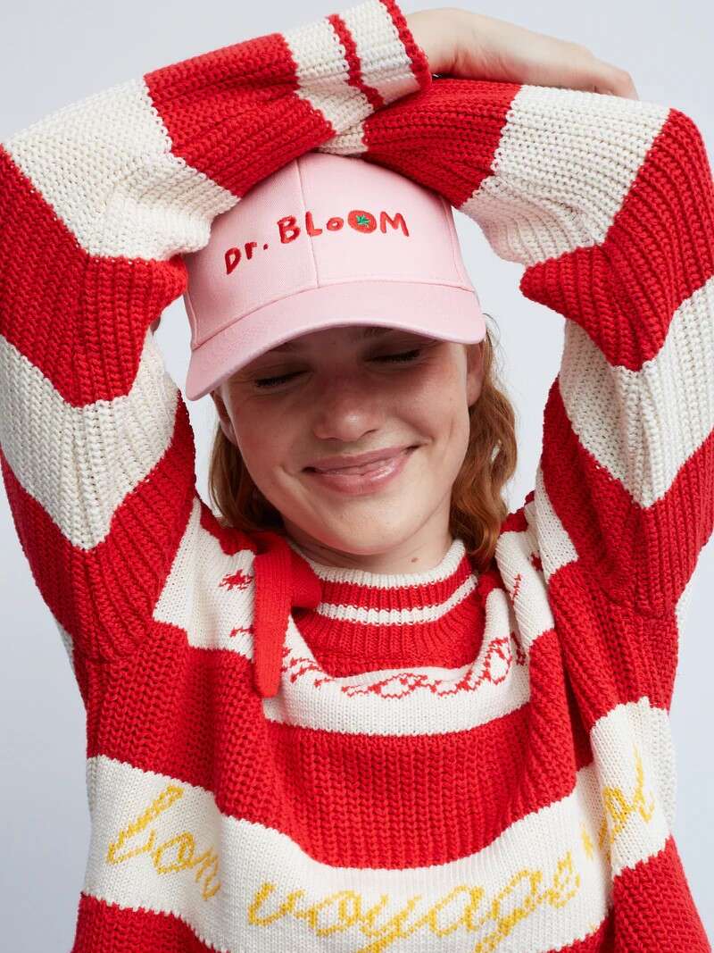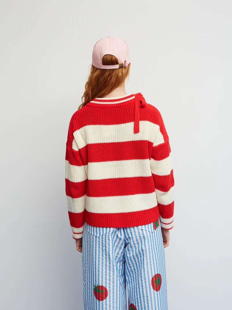 Las rayas en tonos rojo y crudo se combinan con palabras y pequeños símbolos tejidos que hablan de disfrutar, saborear y tomarse la vida con calma y como no, combinando colores para darle ese punto bloom. Cada detalle suma personalidad y convierte la prenda en algo único. El cuello con lazada aporta un aire especial y desenfadado, mientras que su punto suave y su silueta cómoda lo hacen perfecto para el día a día.