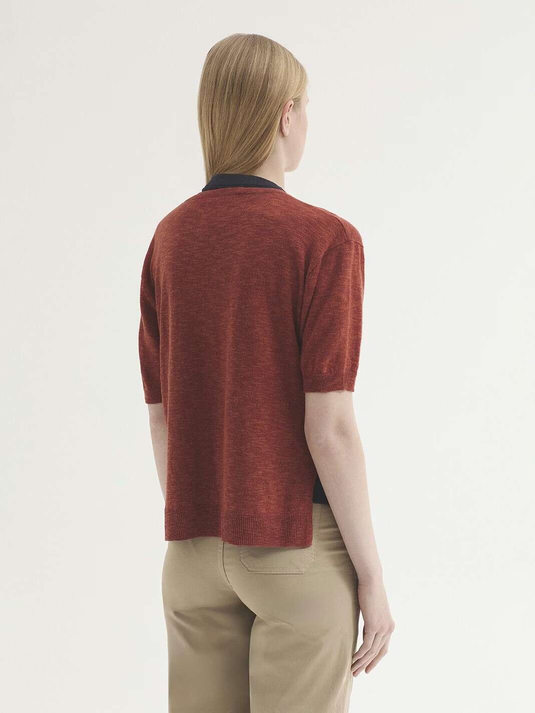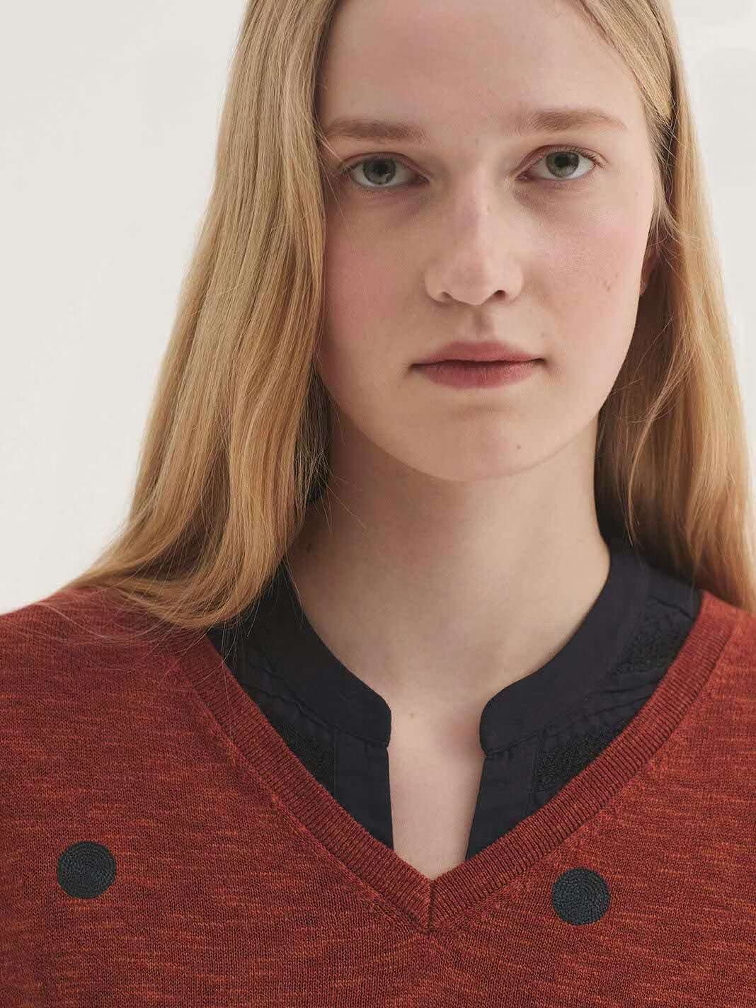Jersey de topos bordados en mezcla de lino y algodón. Escote pico, manga corta, aberturas laterales y acabados en rib.