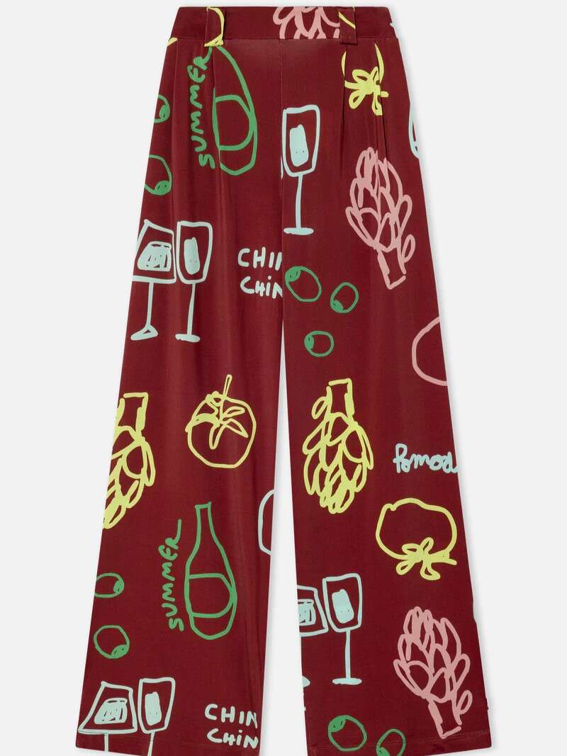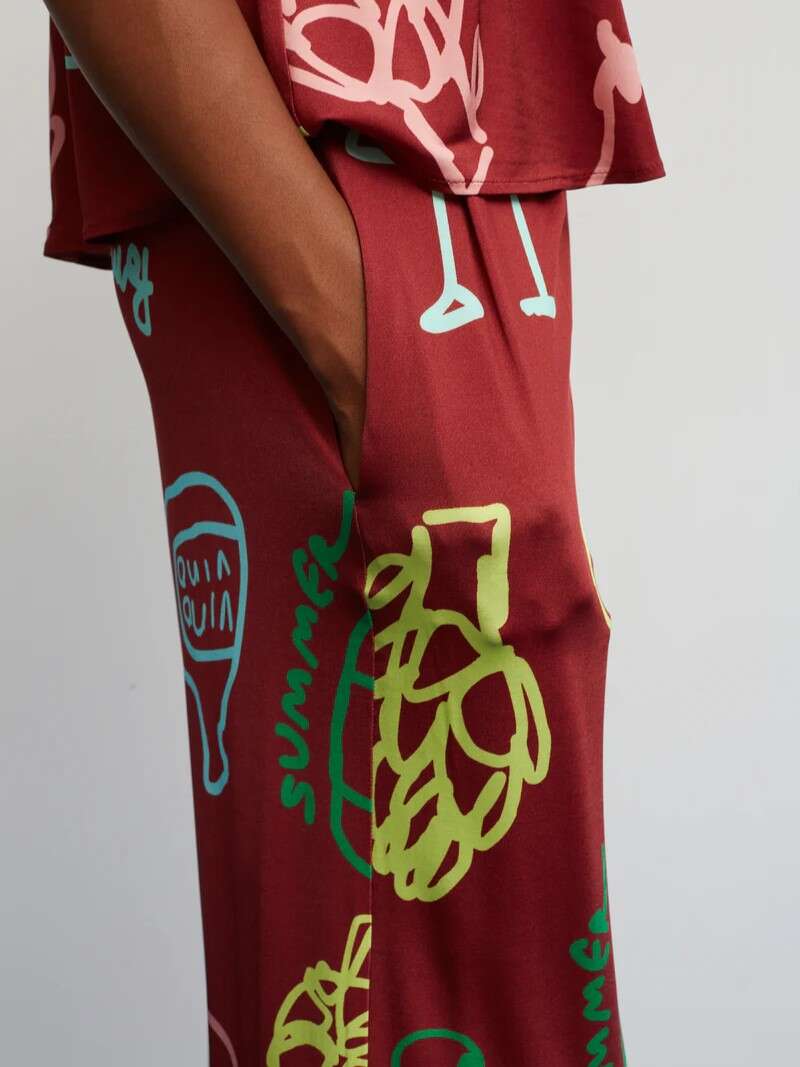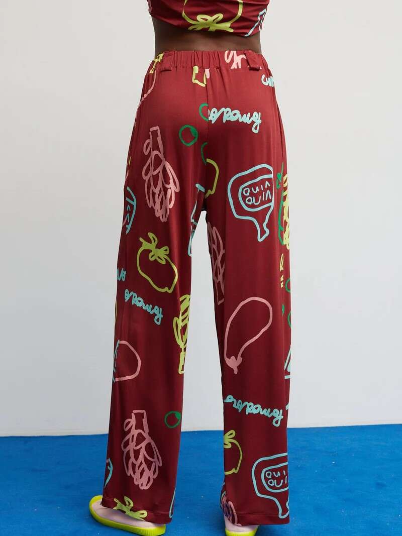 Un pantalón diseñado para brindar bajo el sol. Su fondo granate se combina con un estampado mediterráneo único —copas, botellas, tomates y vegetales— creando un contraste alegre y de pura celebración. Con corte recto y amplio aporta comodidad y movimiento. Su cintura elástica mantiene la prenda práctica y versátil, adaptándose fácilmente a diferentes siluetas.