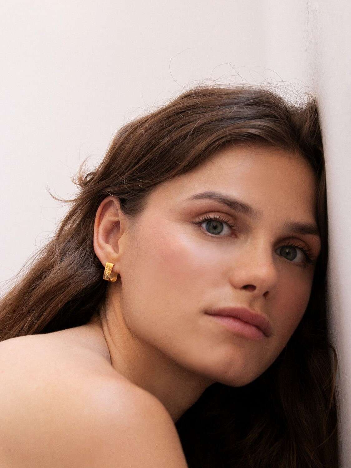 Aros rectangulares pequeños de tiras en metal brillante con baño de oro de 24 K. Diseño ancho con texturas que recuerdan la corteza de algunos árboles mediterráneos. Cierre con presión.