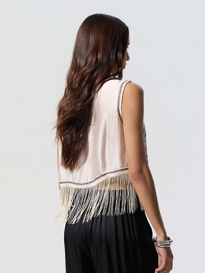 Top corto con flecos, escote redondo, detalles bordados, textura suave, corte regular, acabado satinado.