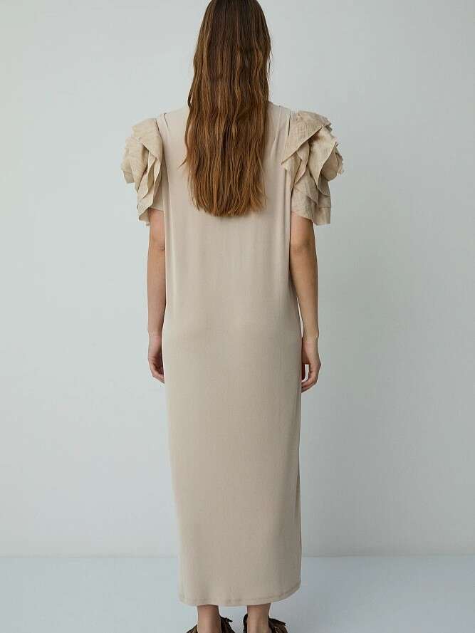 Vestido midi, de manga corta, con volantes en las mangas, con escote redondo, abertura en el lateral, corte regular, textura suave.