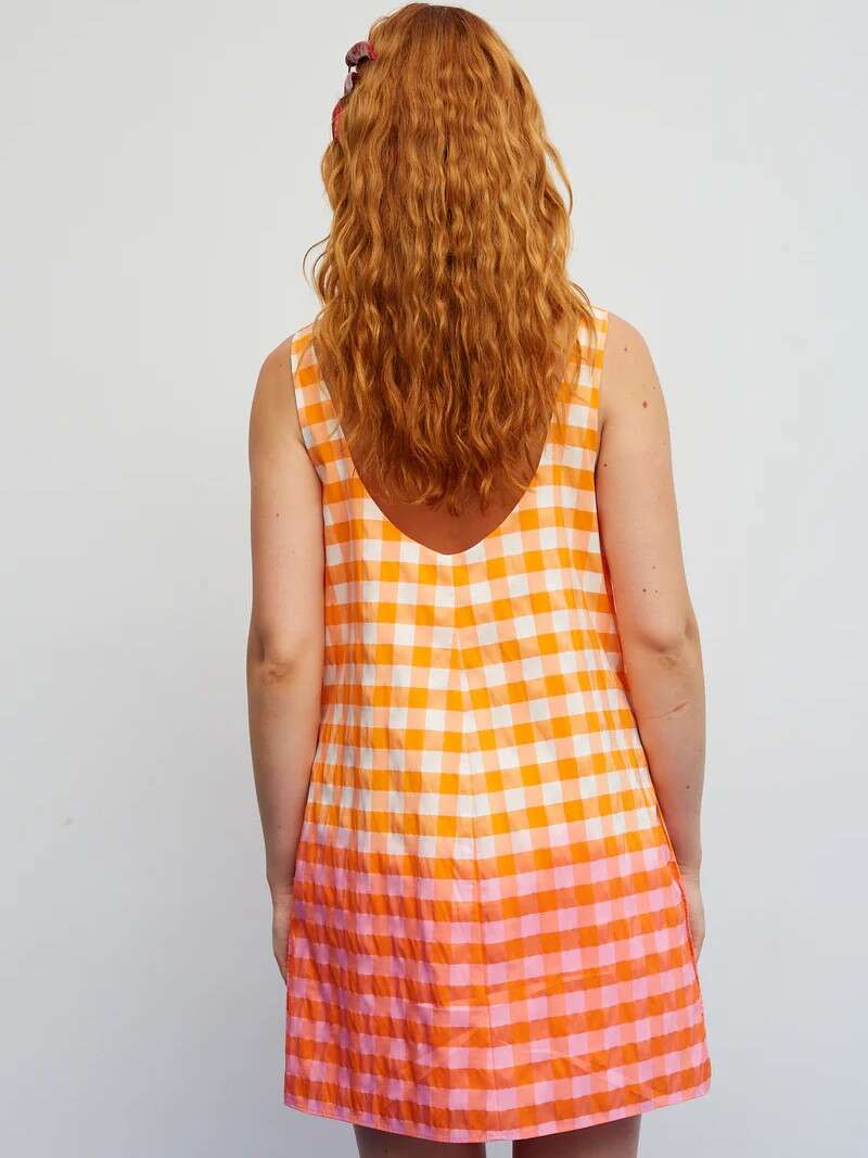 Vestido estampado en tejido técnico. Su estampado vichy juega con un delicado degradado de tonos naranja y rosa, creando un efecto fresco y alegre que recuerda a atardeceres largos y planes improvisados.