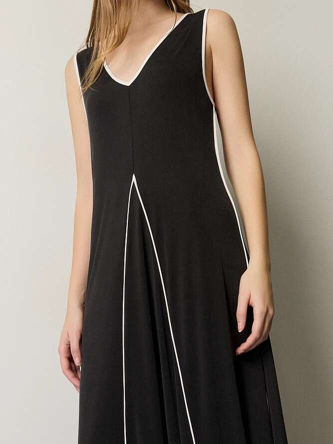 Vestido largo, sin mangas, con escote en pico, detalles en contraste, corte regular, textura suave.