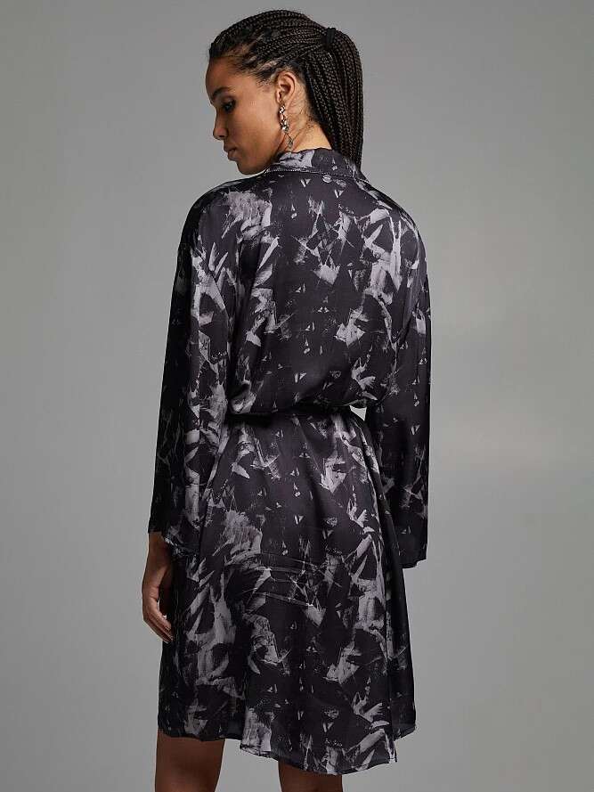 Vestido mini, estampado, chemise, mangas largas, con cuello y detalles metálicos, cierre de botones, cierre con lazo en la cintura, diseño recto, suave al tacto.