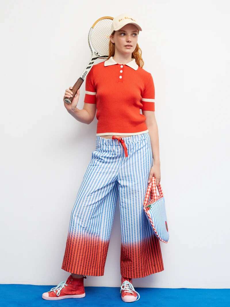 Un polo de punto con vibra retro y mucha personalidad. Su tejido canalé en tono rojo es suave y favorecedor, y los detalles en crudo —cuello, botones y remates— le dan ese toque “reto chic” que combina con todo.